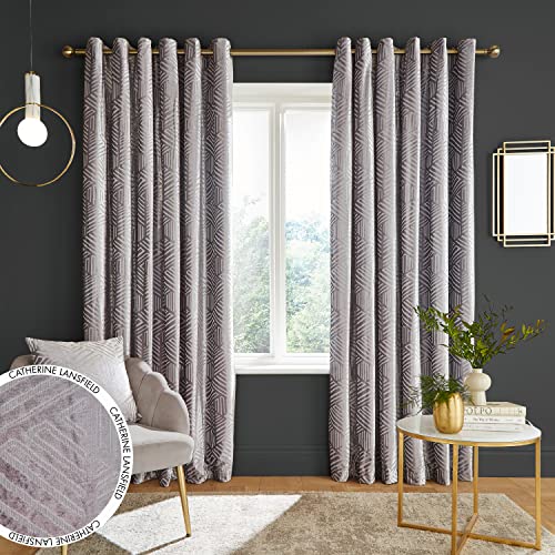Catherine Lansfield Geo Cut Velvet 90x90 Inch Eyelet Curtains Two Panels Silver Grey