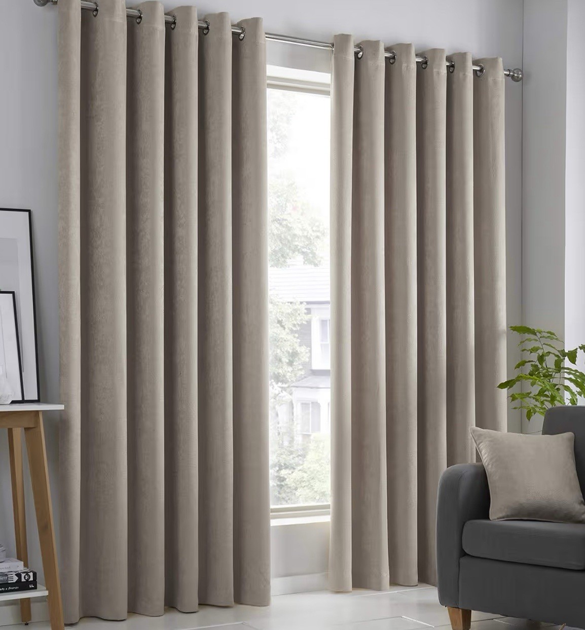 (BEIGE, 90X90) THICK VELVET CURTAINS PAIR OF EYELET RING TOP SOFT
