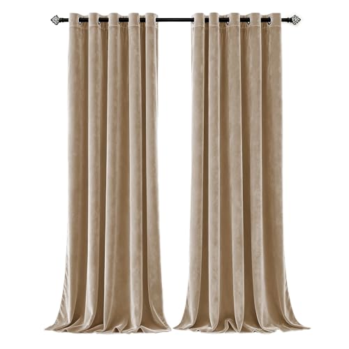 Hafaa Beige Blackout Curtains for Bedroom – Crushed Velvet Curtains 90x90 for Living Room – Eyelet Room Darkening Curtains with 2 Tie Backs – (228cm x 228cm)