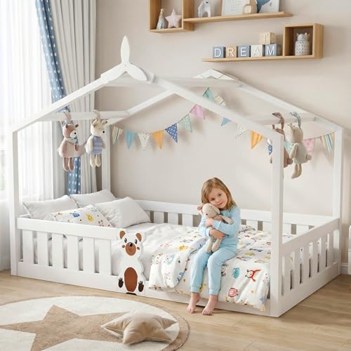 CUPCHID 205 * 95cm Toddler bed,White Wooden House Bed Toddler Solid Pine Wood Modern Children Kids Junior Bed Frame With Canopy Roof (B)