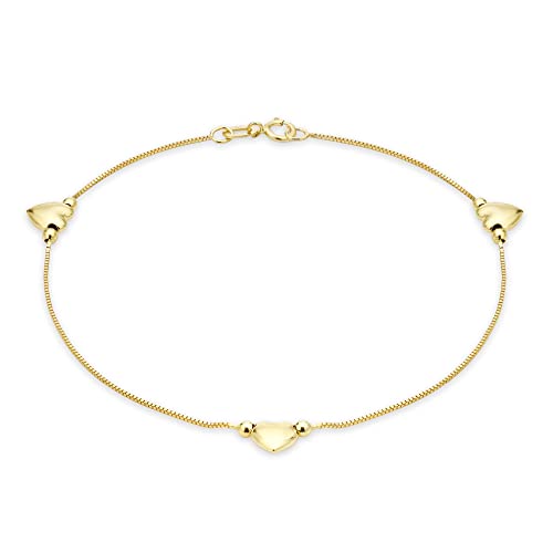 CARISSIMA Women's 9 ct Yellow Gold Three Heart Charm Box Chain Anklet of Length 26 cm/10.25 Inch