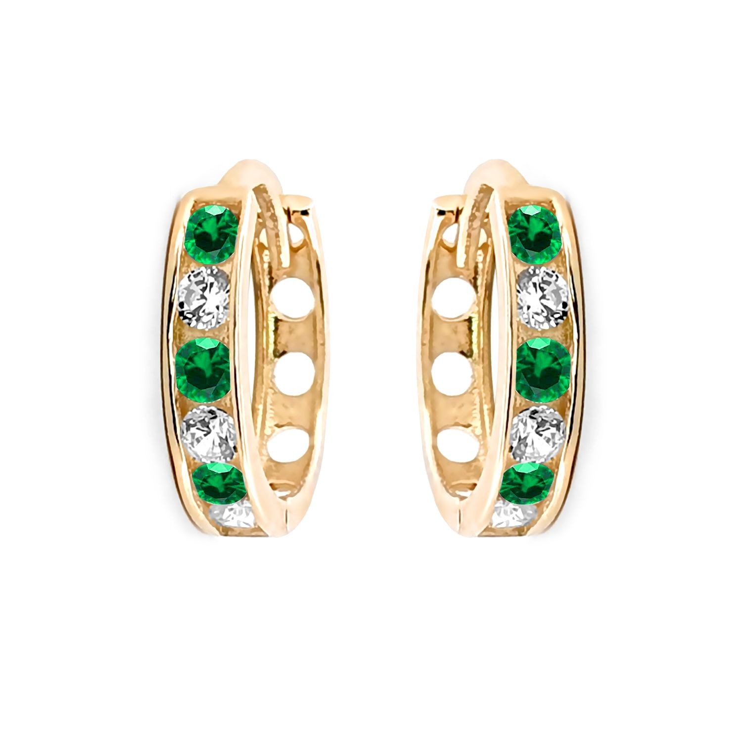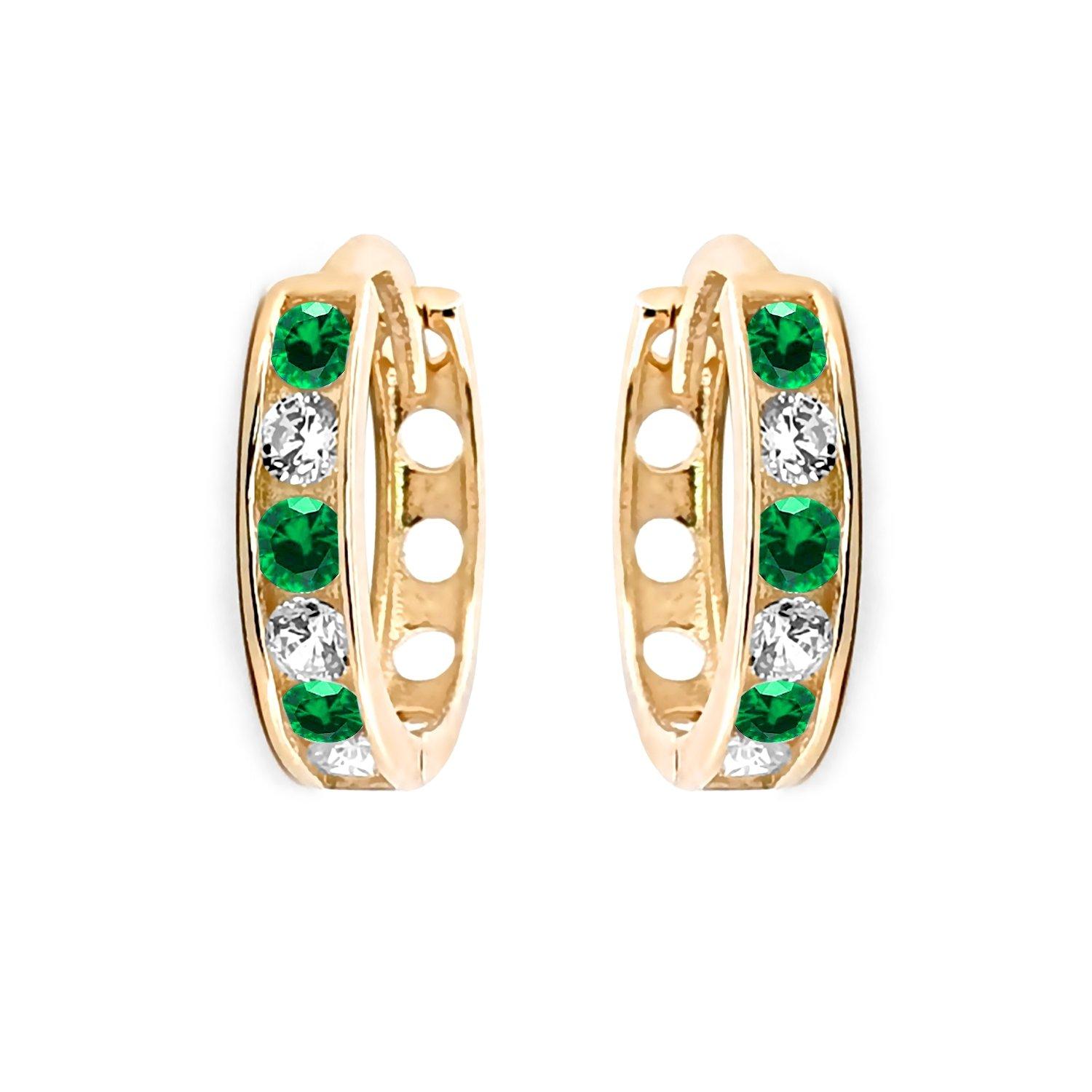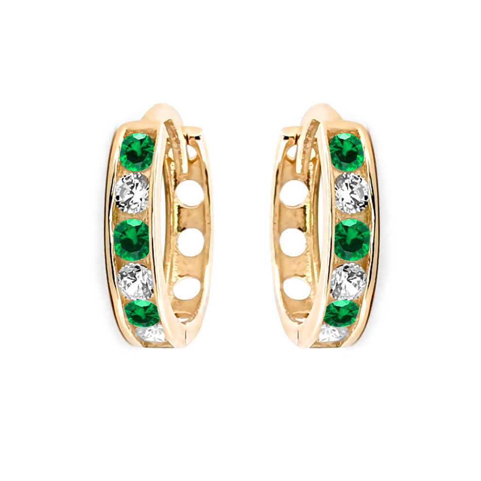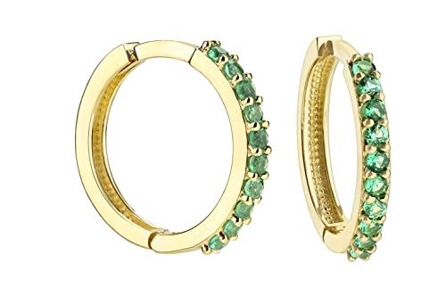 9ct Yellow Gold Emerald Hoop Huggie Earrings - 15mm Diameter - Ladies Gold Hoop Earrings - Womens May Green Emerald BirthStone Gem Earrings - Womens fancy Huggie Hoops
