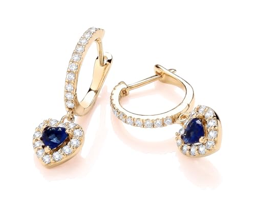 Old English Jewellers 9ct Yellow Gold on Silver Blue Sapphire CZ HEART Charm Drop Dangle Huggie Hoop Earrings