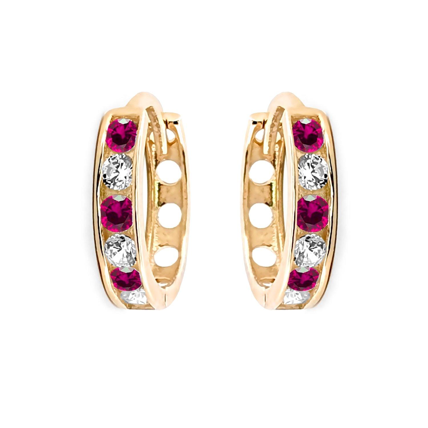 Jewelco London Ladies Solid 9ct Yellow Gold Red Round Brilliant Cubic Zirconia Eternity 2mm Huggie Hoop Earrings 11mm - JER818
