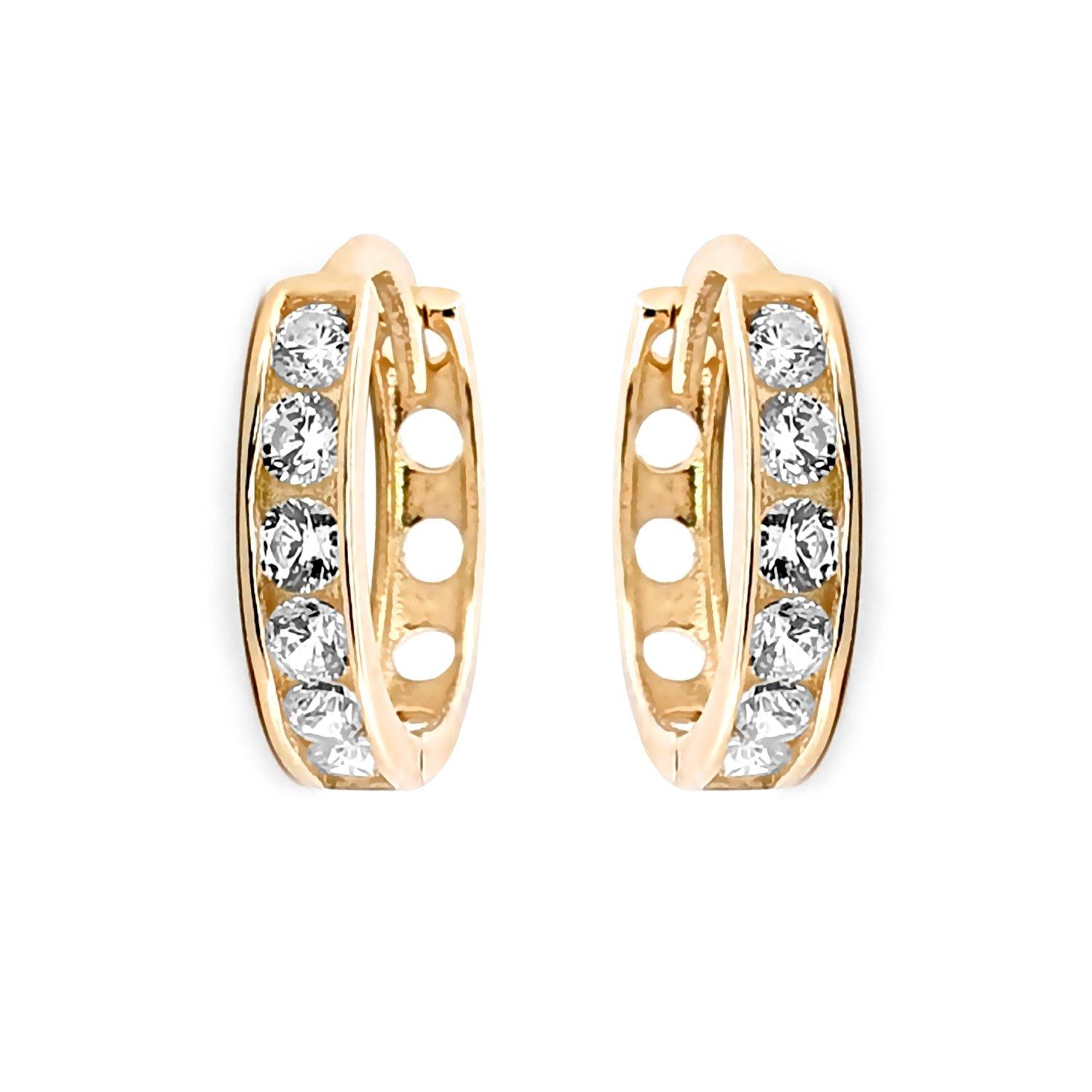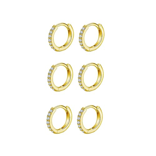 9ct Gold Plated Hoop Earrings, 925 Sterling Silver Post Small Gold Hoop Earrings with AAA Cubic Zirconia, 3 Pairs Small Sleeper Hoops Huggie Hinged Earrings (10mm*3)