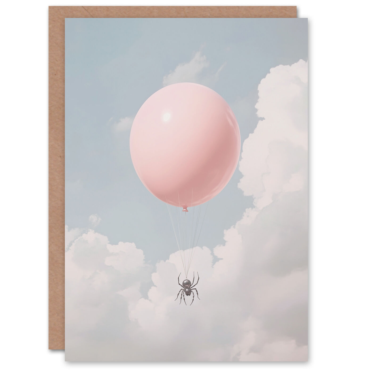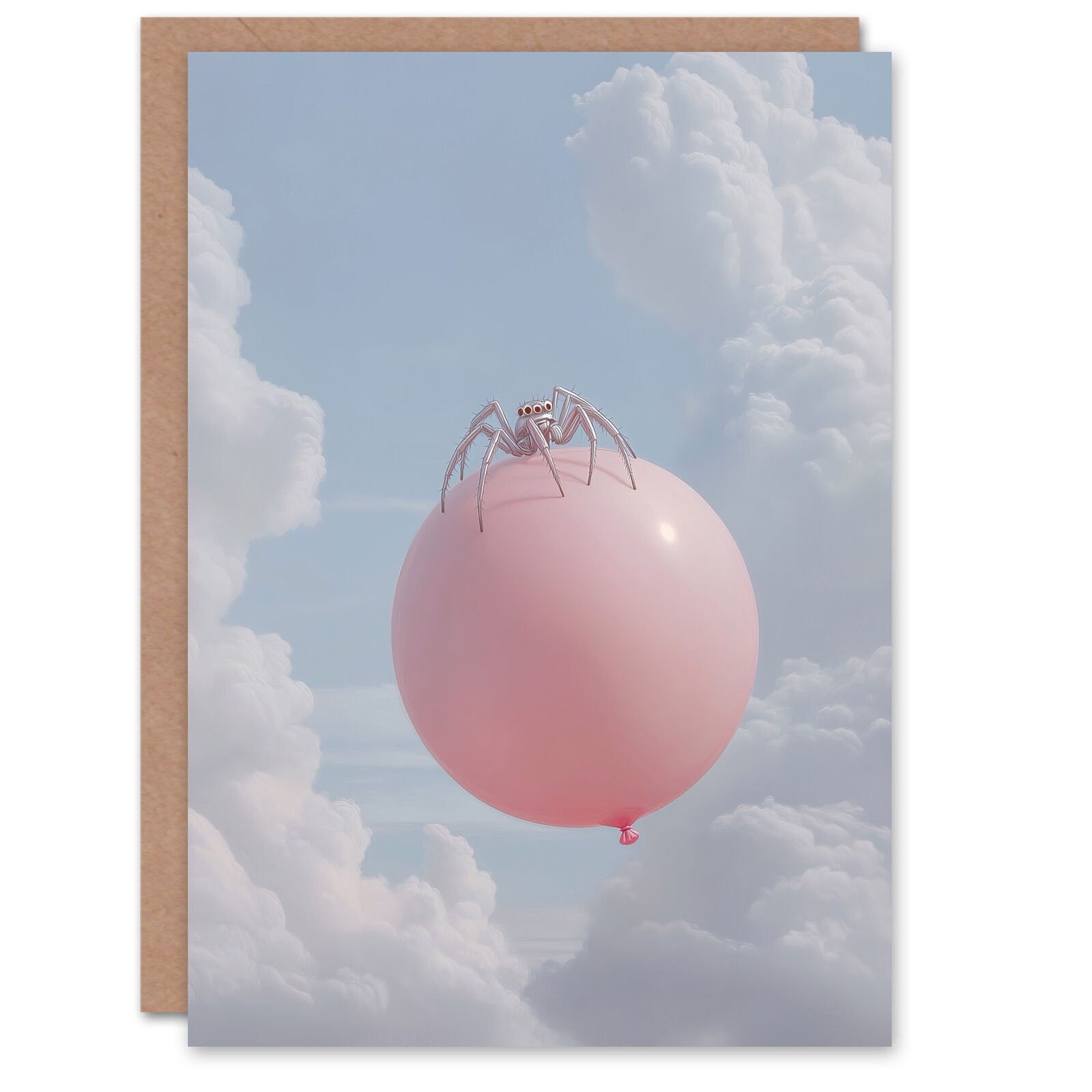 Spider Travel Floating in Sky with a Pink Balloon Farewell Greeting Card
