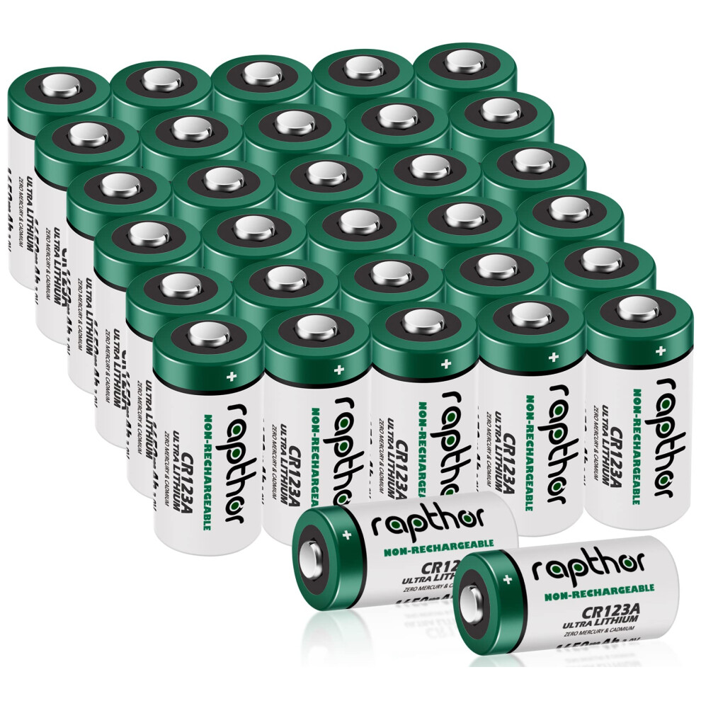 Rapthor 1650mAh CR123A 3V Lithium Battery CR123 / 123A / 123 / CR17345 with Built-in PTC for Flashlight Toys Smoke Sensor Alarm System Microphones (32Pack)