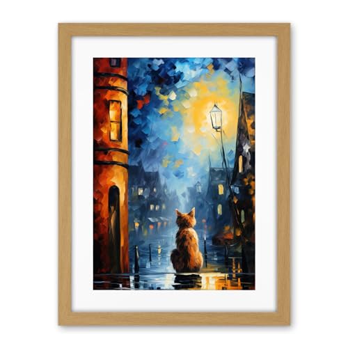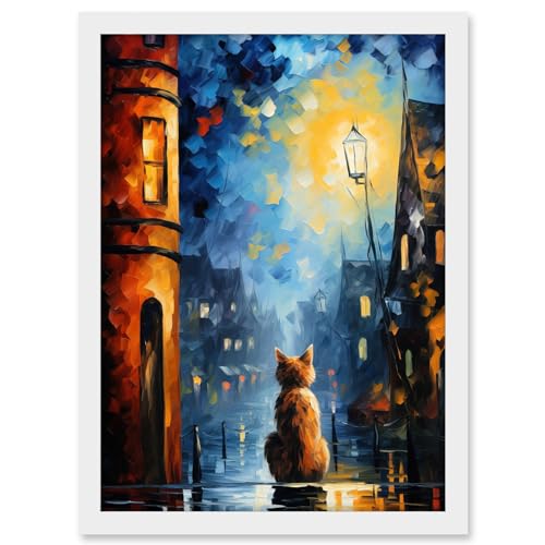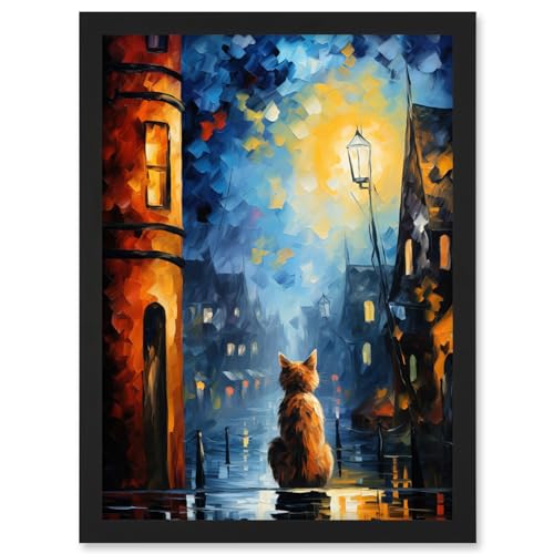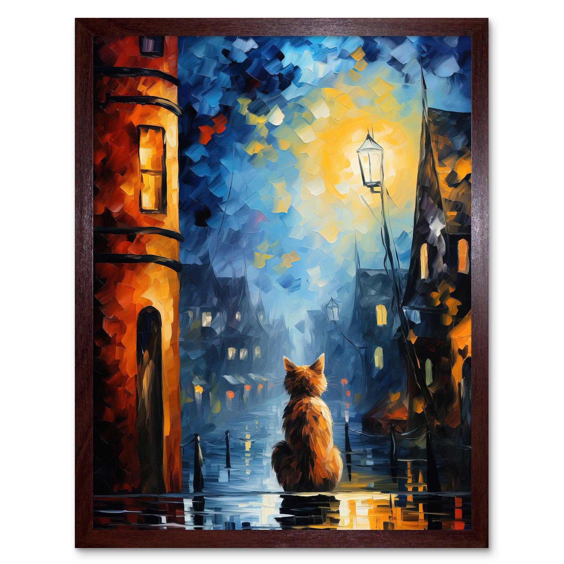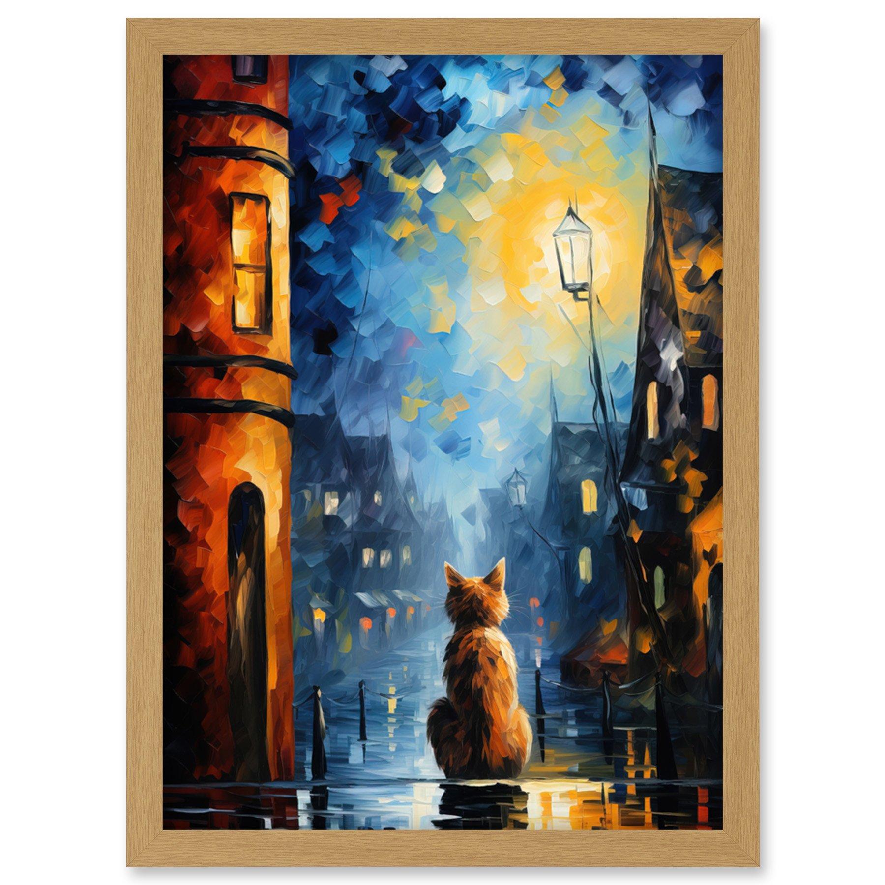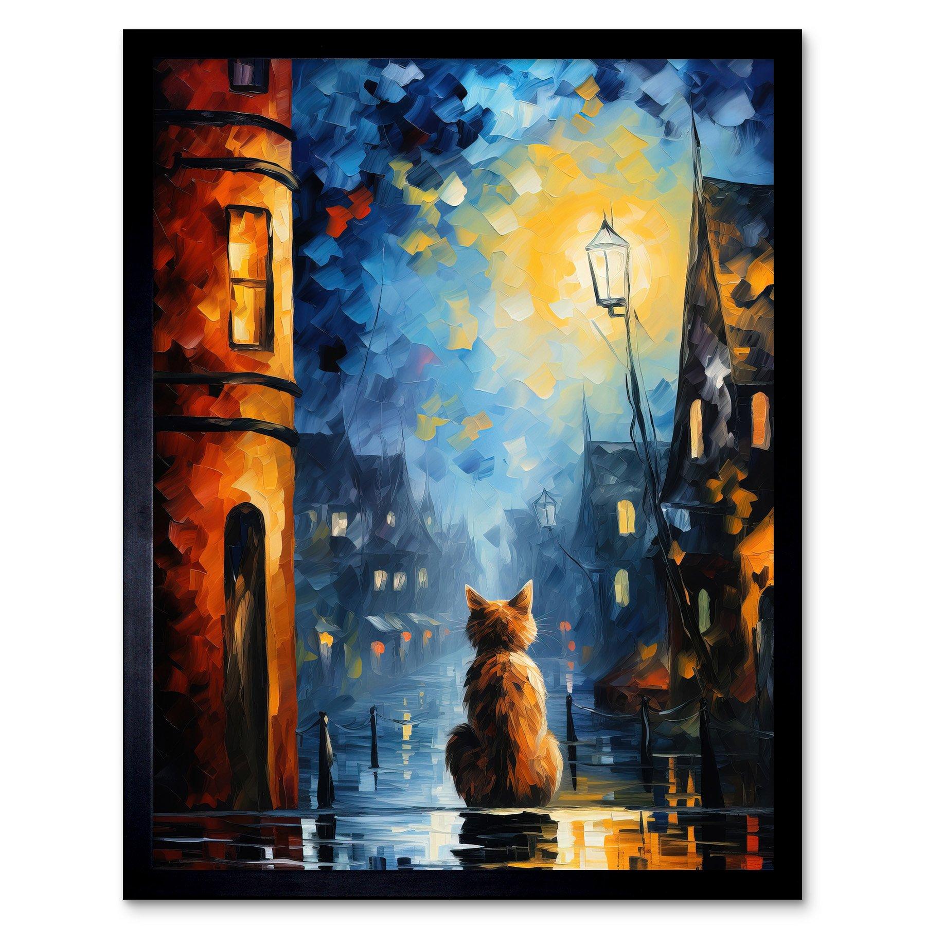 Artery8 A Street Cat Named Desire Palette Knife Oil Painting Ginger Cat Village Night Artwork Framed A3 Wall Art Print