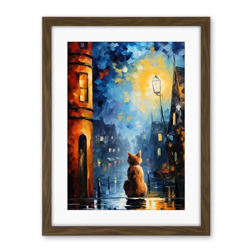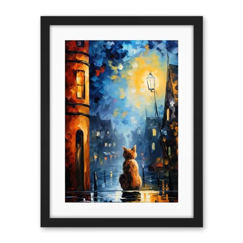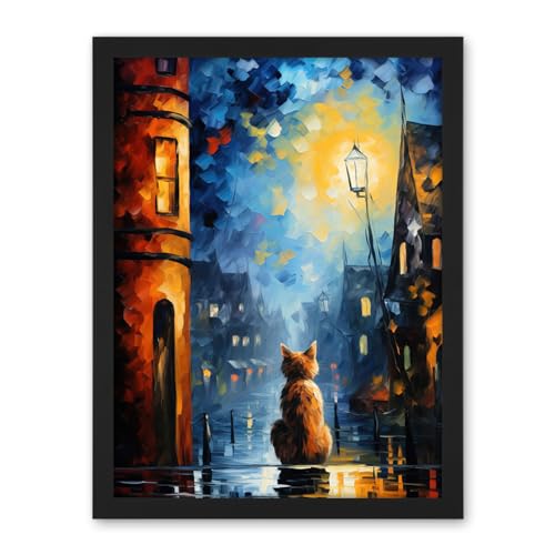 Artery8 A Street Cat Named Desire Palette Knife Oil Painting Ginger Cat Village Night Artwork Framed Wall Art Print 18X24 Inch