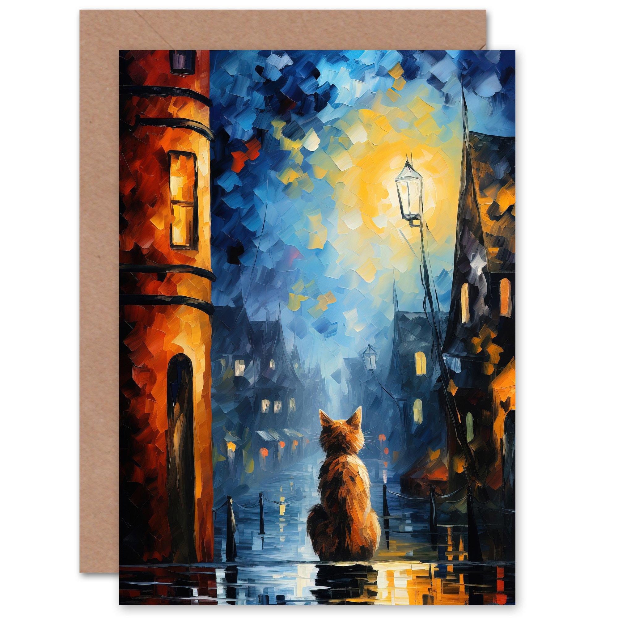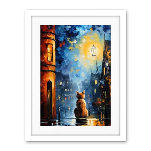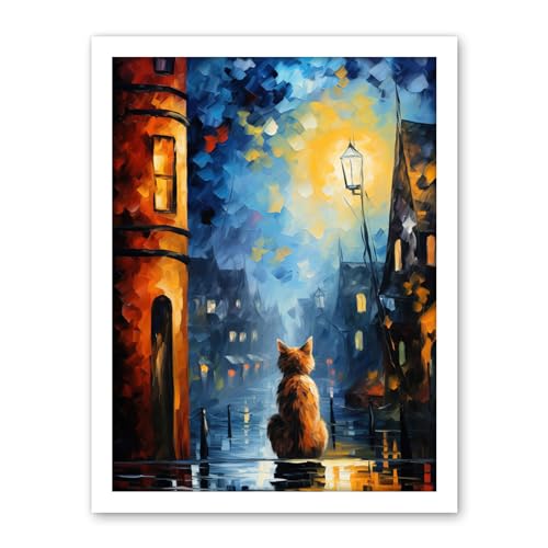 Artery8 A Street Cat Named Desire Palette Knife Oil Painting Ginger Cat Village Night Large Wall Art Poster Print Thick Paper 18X24 Inch