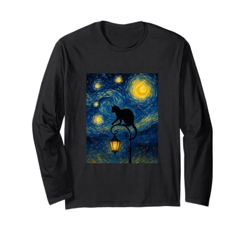 Starry Night Cat Balancing On A Street Lamp for Cat Lovers Long Sleeve T-Shirt