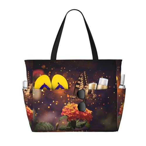 Xiso Ver Large Beach Tote Bag for Women Extra Large Capacity Waterproof Sandproof Pool Bag Suitable for Swimming Pool Gym Groceries Travel - Butterfly Sitting on a Flower, Black, One Size