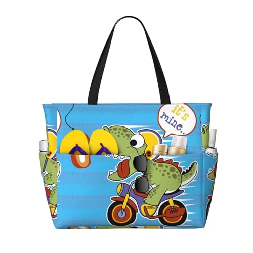 Xiso Ver Large Beach Tote Bag for Women Extra Large Capacity Waterproof Sandproof Pool Bag Suitable for Swimming Pool Gym Groceries Travel - Dinosaur Riding a Motorcycle, Black, One Size