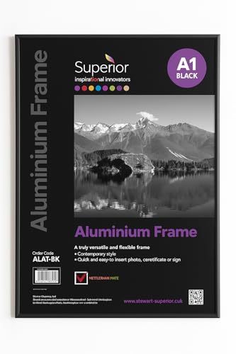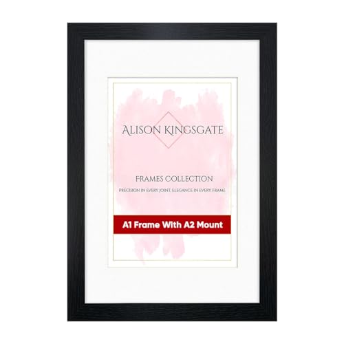 Alison Kingsgate A1 Black Picture Frame with Mount for A2 Photo - Engineered Wood Photo Frame with Precision Cut Cardboard Mount - Ideal for Photos, Posters & Artwork - Wall or Tabletop Display