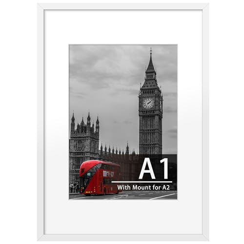 Tinkeps A1 White Picture Frame, Engineered Wood and Plexiglass, A1 Frame with A2 Mount for A2 Prints, Photos, and Posters, Wall Mountable, (59.4×84.1cm) Poster Frame