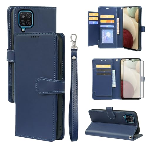 Asuwish Phone Case for Samsung Galaxy A12/M12 Wallet Cover and Tempered Glass Screen Protector Leather Card Holder Slot Stand Rugged Mobile Cell Accessories A 12 5G A-12 S12 12A 4G Women Men Blue