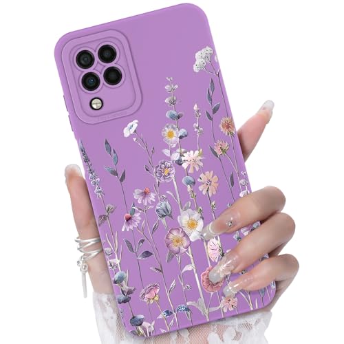 CASBST for Samsung Galaxy A12 Phone Case, Cute Fashion Flower Pattern Design Girls Women Liquid Silicone Cover, Slim Shockproof and Scratch-Resistant Soft Case for Samsung A12 - Purple
