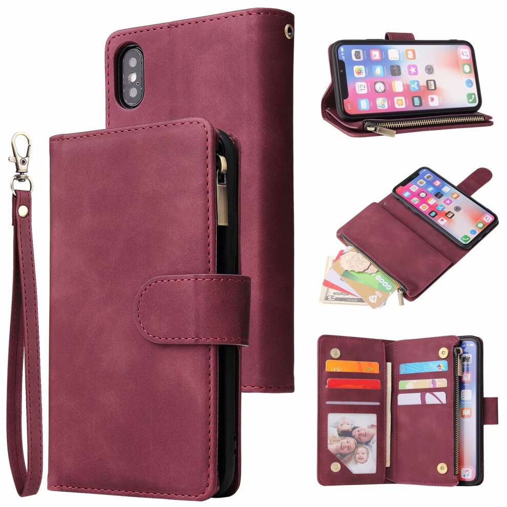 (Wine Red) Compatible with Samsung A16 phone caseï¼Magnetic Closure Zipper Pocket Case Slots Wrist Strap Shockproof Flip Cover