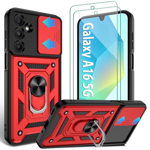 Jshru for Samsung A16 Phone Case with 2 Pcs Screen Protector | Camera Protection Cover | Military Grade Shockproof | Ring Kickstand,Red-A16