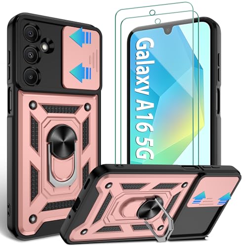 Jshru for Samsung A16 Phone Case with 2 Pcs Screen Protector | Camera Protection Cover | Military Grade Shockproof | Ring Kickstand,Rose Gold-A16