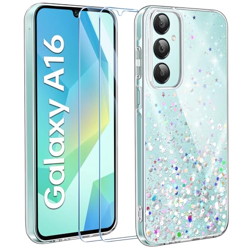 ivencase Clear Glitter Case Compatible with Samsung A16 Phone Case with 2 Screen Protector, TPU Silicone Sparkly Bling Star Soft Cover Flexible Transparent Shockproof Cover Samsung Galaxy A16