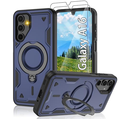 Jshru 3 in 1 Magnetic for Samsung A16 Phone Case | Built-in Stand | 2 Pack HD Screen Protector,Military-Grade Shockproof Protective Cover for Samsung Galaxy A16,Navy Blue