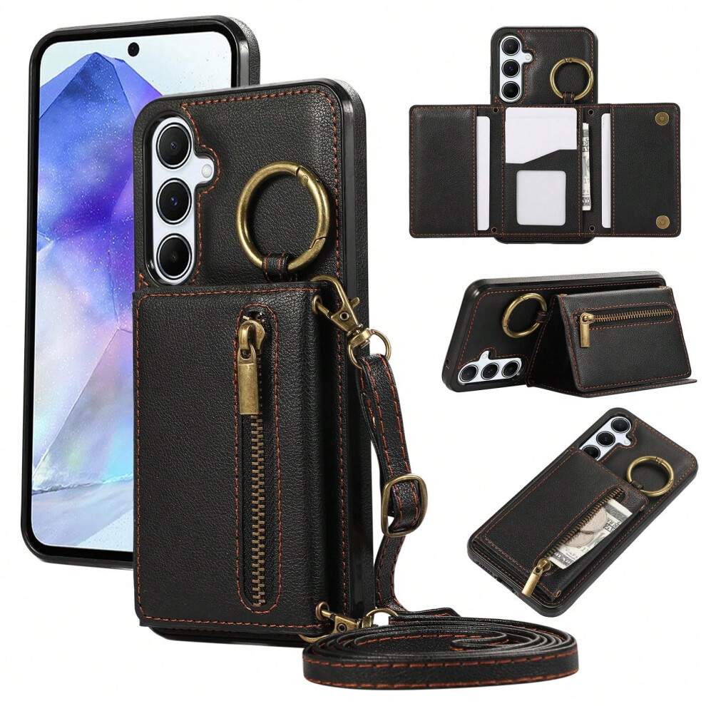 (Black + long rope, Samsung A24) Suitable for Samsung S25Ultra mobile phone case A56 multi-function zipper card holder diagonal rope A35 finger ring b