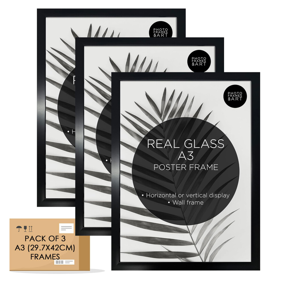 pf+a REAL GLASS 3 Pack A3 Picture Frames - A3 Black Frame Set of