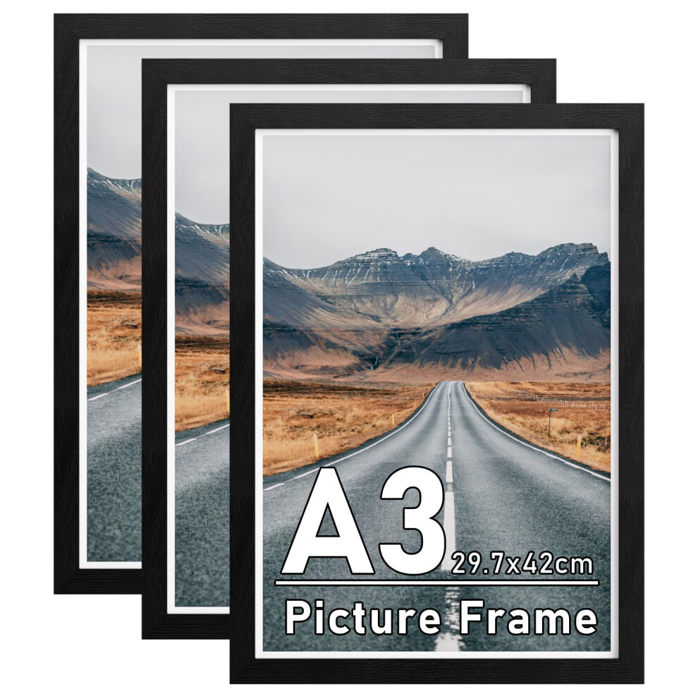 3 Pack A3 Frame Black, A3 Picture Frame, Black Picture Frames 29.7 x 42 cm, A3 Picture Frames with Wall Hanging, Wooden A3 Photo Frame