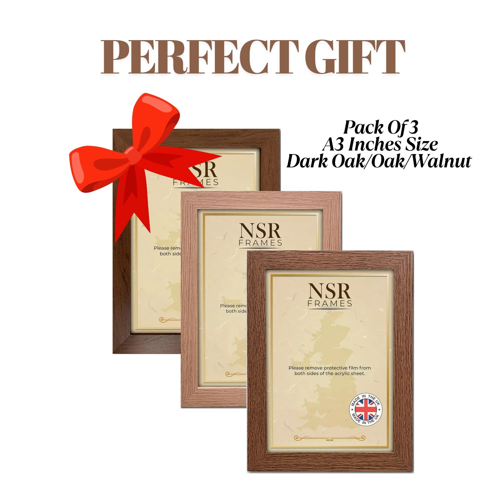 (Pack Of 3) Natural Wooden Picture ,Photo Frames, A3 Size (Walnut,Oak,Dark Oak)