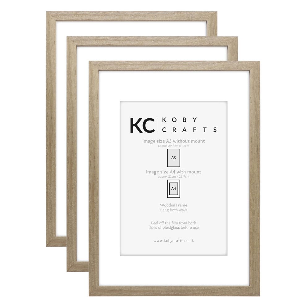 Koby Crafts Pack of 3 Wood Effect Picture Frames for A4 or A3 Images | 3 Pack A3 Wooden Photo Frames | Hang Portrait/Landscape | A3 Posters Certificates with A4 Image Mount