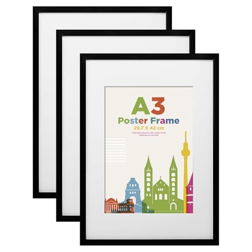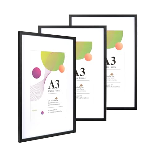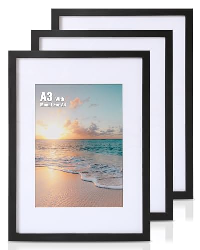 VUVUZULA A3 Frame Black Photo Frame A3 Picture Frames A3 Black Frame with Mount for A4 Print Set of 3 with Perspex Glass