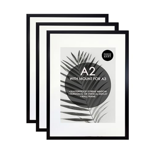pf+a REAL GLASS 3 Pack A2 For A3 Picture Frames - A3 Black Frames With Mount Set of 3 / 42x59.4cm Frames For Posters, Photos, Artwork - Portait & Landscape Display