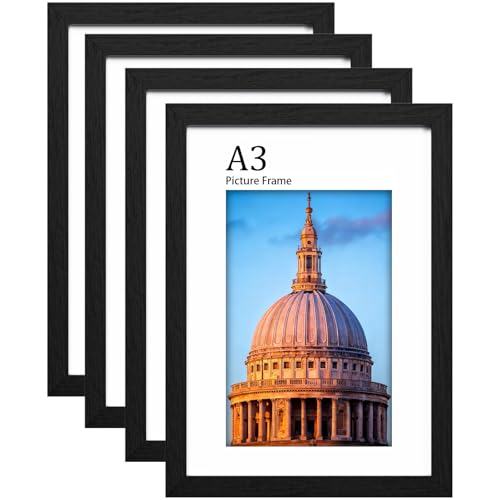 A3 Picture Frames,A3 Frame 100% Solid Wood Matted for A4, a3 Photo Frames with Acrylic Glass,A3 Poster Frames for Wall Mounting, 29.7 X 42 cm Certificate Frame for Portrait, Set of 4, Black