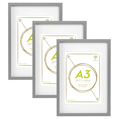 Grey A3 Boxed Picture Frames Set of 3 with Double Mounts for A4 & 6x8 photo, A4 boxed photo frames for 3pack, Grey A3 wooden Poster Frame with Mount for A4 picture Frames