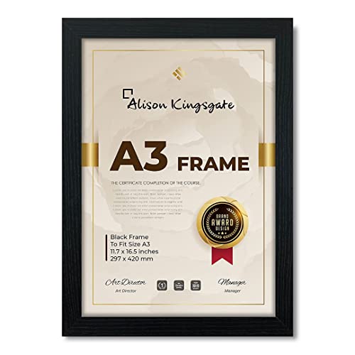 Alison Kingsgate Premium A3 Frame in Size 30x42cm - A3 Picture Frame Black with Clear Perspex Sheet & Wall Mounted Hook - Black A3 Picture Frames - A3 Poster Frames