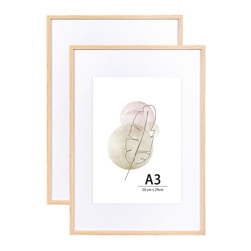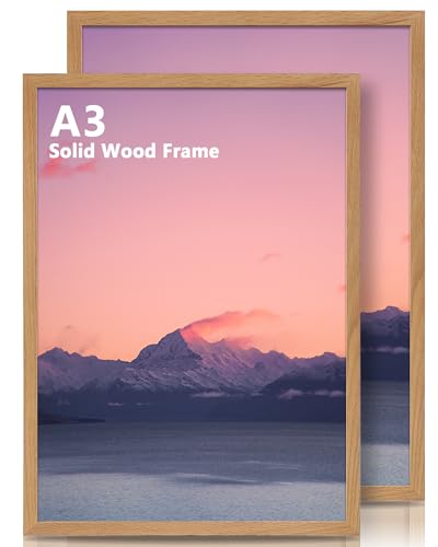 KAIWIN A3 Picture Frame Oak Set of 2, Wooden Poster Frame suitable for A4 with mat, A3 Picture Frames for Wall Mounting Display for Home,Office,Gallery,Holiday with Photos, Posters, Puzzles