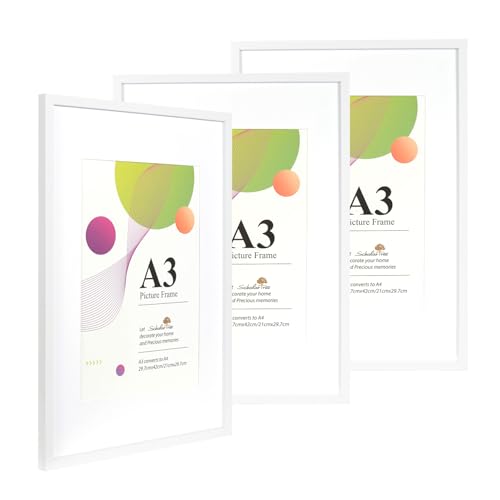 Scholar Tree A3 White Frame - 3 Pack A3 Picture Frame, White Picture Frames 29.7 x 42cm, A3 Picture Frames with Wall Hanging, Wooden Photo Frames with A4 Mount
