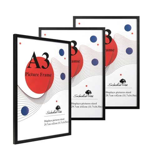 Scholar Tree A3 Black Frame - 3 Pack A3 Picture Frame, Black Picture Frames 29.7 x 42cm, A3 Picture Frames with Wall Hanging, Wooden Photo Frames with A4 Mount