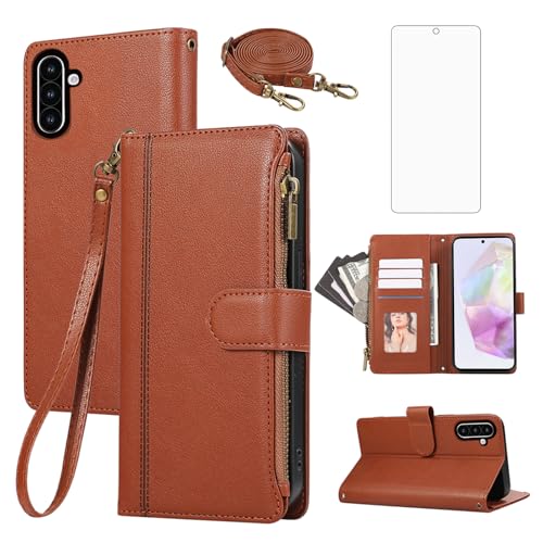 Asuwish Phone Case for Samsung Galaxy A36 5G Zipper Wallet Cell Cover with Screen Protector Wrist Crossbody Strap Lanyard Flip Credit Card Holder Stand Leather A 36 36A A365G Women Men Girls Brown