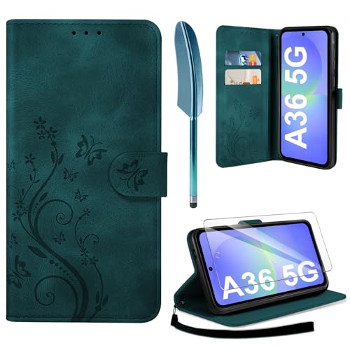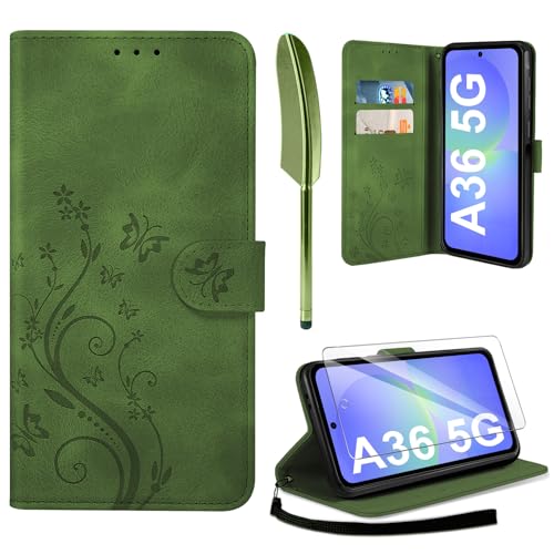 Hancda Phone Case for Samsung Galaxy A36 5G Leather Case with Tempered Glass Screen Protector Wallet Card Holder Slot Flowers Design Magnetic Phone Case Flip Cover for Samsung A36 5G,Green