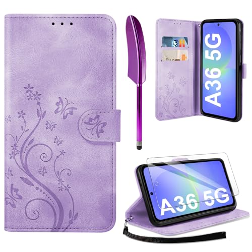 Hancda Phone Case for Samsung Galaxy A36 5G Leather Case with Tempered Glass Screen Protector Wallet Card Holder Slot Flowers Design Magnetic Phone Case Flip Cover for Samsung A36 5G,Purple