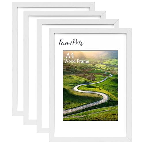 FamiPrts 4Pack A4 Frame, Wooden A4 Picture Frames, Versatile White A4 Frame, Dual Orientation (Landscape/Portrait), Includes Stand & Wall Hooks - Wall Mount or Tabletop for Home, Office, Gallery