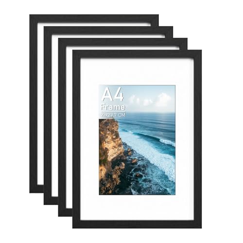FamiPrts 4Pack A4 Frame, Wooden A4 Picture Frames, Versatile Black A4 Frame, Dual Orientation (Landscape/Portrait), Includes Stand & Wall Hooks - Wall Mount or Tabletop for Home, Office, Gallery