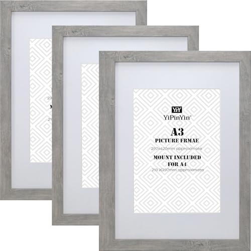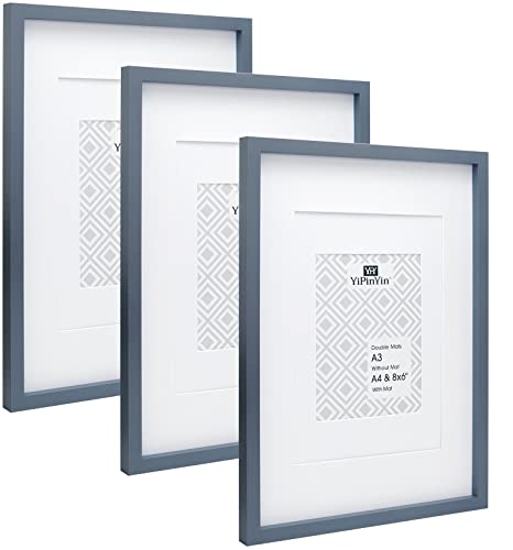 Grey A3 Boxed Picture Frames Set of 3 with Double Mounts for A4 & 6x8 photo, A4 boxed photo frames for 3pack, Grey A3 wooden Poster Frame with Mount for A4 picture Frames