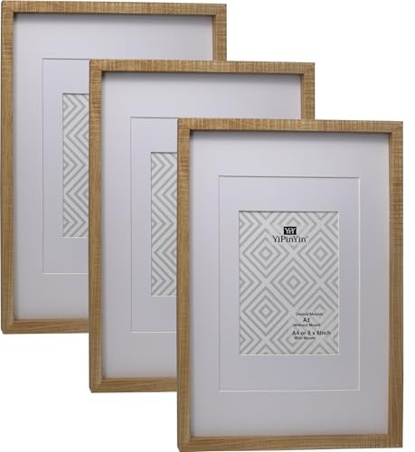 Natural Wood Effect A3 Boxed Picture Frames Set of 3 with Double Mounts for A4 & 6x8 photo, A4 boxed photo frames for 3pack, A3 wooden Poster Frame with Mount for A4 picture Frames
