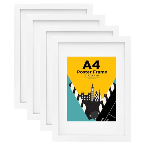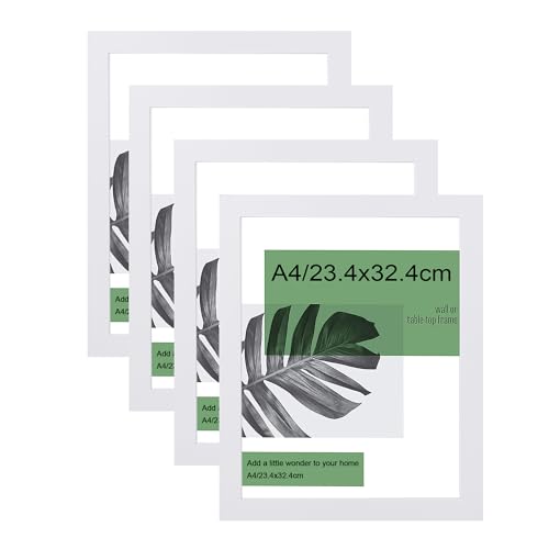 EGOFINE A4 Frames White Set of 4 - Made of Solid Wood A4 Picture Frames, A4 Photo Frames with A5 Mat, A4 Poster Frame with Plexiglass for Table Top and Wall Mounting