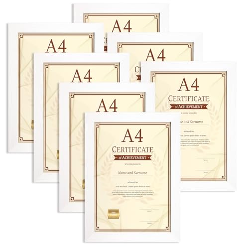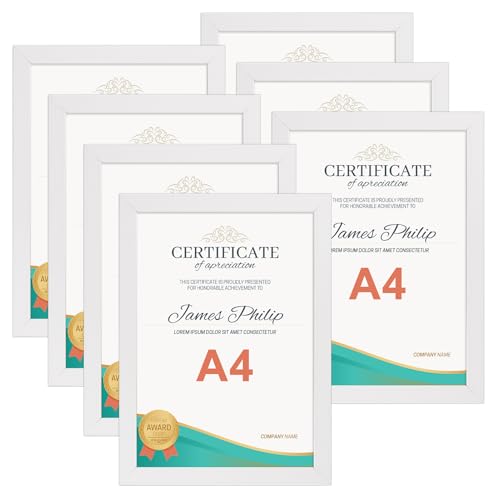 Vasemouh A4 Picture Frame Set of 7, White A4 Photo Frames for Photos, Certificates, Prints and Posters, Tabletop & Wall Mounting