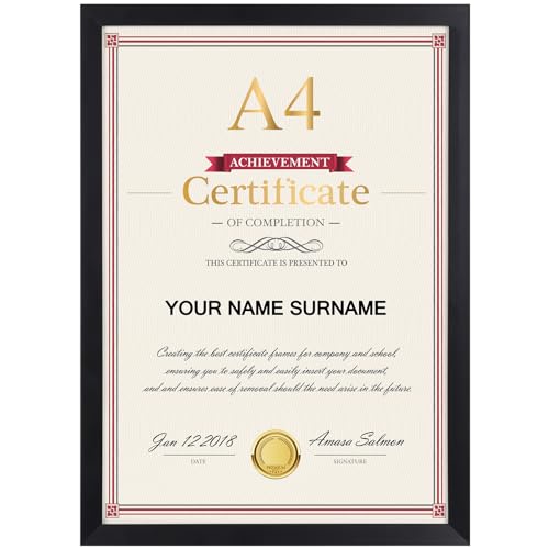 A4 Black Solid Wood Frame, A4 Picture Frame, A4 Photo Frames, A4 Poster Frame with Acrylic Glass, 21cm x 29.7cm Certificate Frame for Table Top and Wall Mounting, Black (Black)