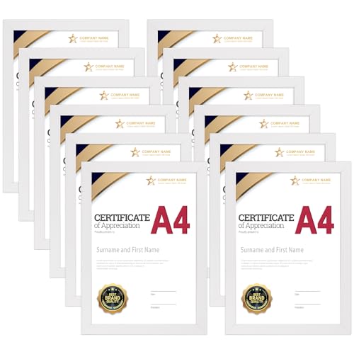 EXYGLO 12 Pack White A4 Picture Frame Set, Versatile A4 Photo Frames - Ideal for Wall or Desk Display of Certificates in Home and Office